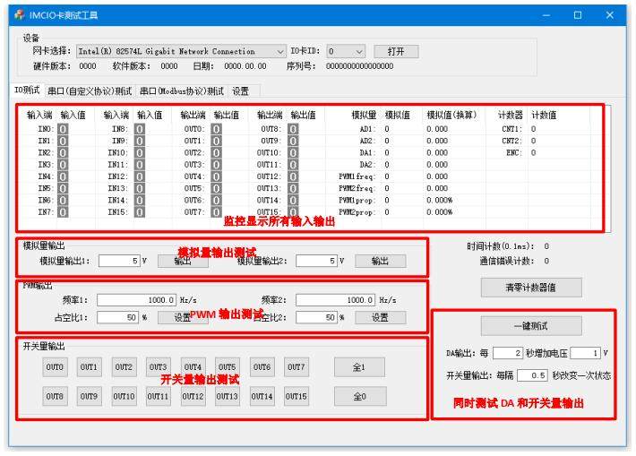 提供的资料附带有 IMCIO_Test软件,通过此软件可测试以太网通用 IO 卡的所有功能。